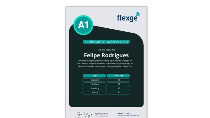 No ícone de PDF também em "Actions" o teacher pode fazer o download do certificado de proficiência do aluno. O certificado pode ser utilizado para comprovar o nível de proficiência no idioma (A1, A2, B1, B2, C1 e C2). Modelo do certificado abaixo: